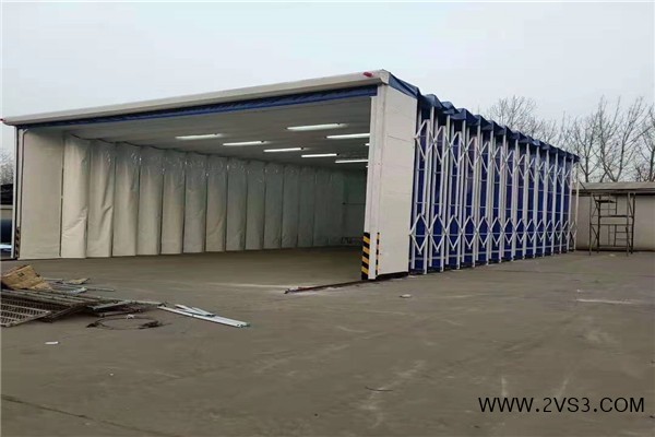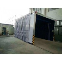 环保移动喷漆房 轨道移动房出厂价格 整个伸缩棚由以下几部分构成:门框架、帆布支撑网、剪式伸缩机构、阻燃PVC帆布、驱动机构等部分组成。门框架采用工业型材制成,是驱动电机直接带动的部分,整个伸缩机构稳定运动的关键所在。大门框架上设置有开关按钮并行程开关,用以自动控制大门的伸缩。除去门框,其余部位就是帆布支撑网,是阻燃帆布安装连接的骨架,由多组型材骨架构成,并通过剪式伸缩机构将整个相对独立的骨架连接在一起,形成一个稳定的整体。在每两个帆布支撑网之间,采用剪式伸缩机构相连,其结构尺寸决定了伸缩量,同时为了保证上下都能同时实现伸缩动作,在每侧上下各布置一套剪式伸缩机构,两者之间通过连杆形成一个同步运动机构。在整个网架之间采用工业阻燃PVC帆布,这是形成相对封闭作业间的“墙板”,也是保证空气有序流动的“房体”。安装时每两个支撑网采用一块工业帆布。在喷漆室的大门上安驱动部分。驱动部分采用减速电机,传动到多节长轴上,再由长轴两端链轮同步传动到两侧主动轮上。整个驱动前进、后退采用保护:双向两级行保护轨道终端设置限位车挡;门柱上边有控制盒,操作方便。环保移动喷漆房 轨道移动房出厂价格